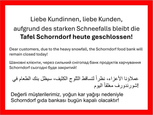 aufgrund des starken Schneefalls über Nacht bleibt die Tafel Schorndorf heute (26.01.2026) geschlossen.