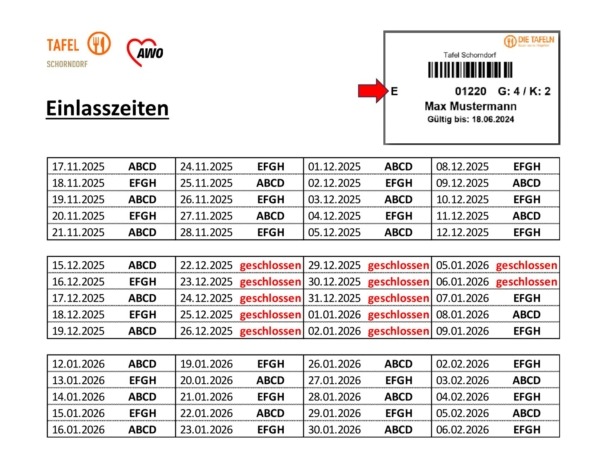 Um die Kundenströme gleichmäßig zu verteilen, darf jeder Haushalt nur an jedem zweiten Werktag (Montag bis Freitag) einkaufen. Zu diesem Zweck wird jeder Haushalt einer der beiden Kundengruppen „A, B, C, D“ oder „E, F, G, H“ zugeteilt. Der auf dem Tafelausweis vermerkte Buchstabe (siehe unten) zeigt an, welche der beiden Kundengruppen der Haushalt zugeteilt ist.